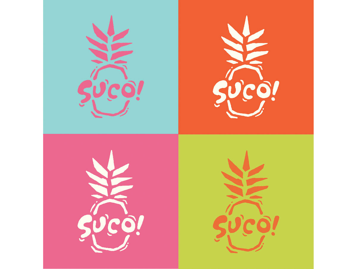 A logo and packaging design for a new tropical juice line. Inspired by Brazil, where the fruits are sourced, "Suco" means "fruit juice" in Portuguese. The vibrant colors, imperfect edges, and organic label shape capture the drink’s fresh and playful energy.